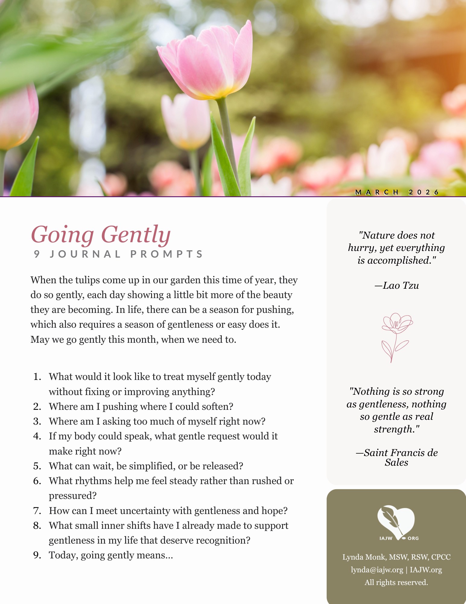 When the tulips come up in our garden, in the spring, they do so gently, each day showing a little bit more of the beauty they are becoming. In life, there can be a season for pushing, which also requires a season of gentleness or easy does it. Let these journal prompts help you explore what “going gently” means to you at this time.